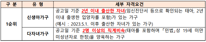 - 신생아 가구 > 다자녀 > 예비신혼 > 기타 무주택자